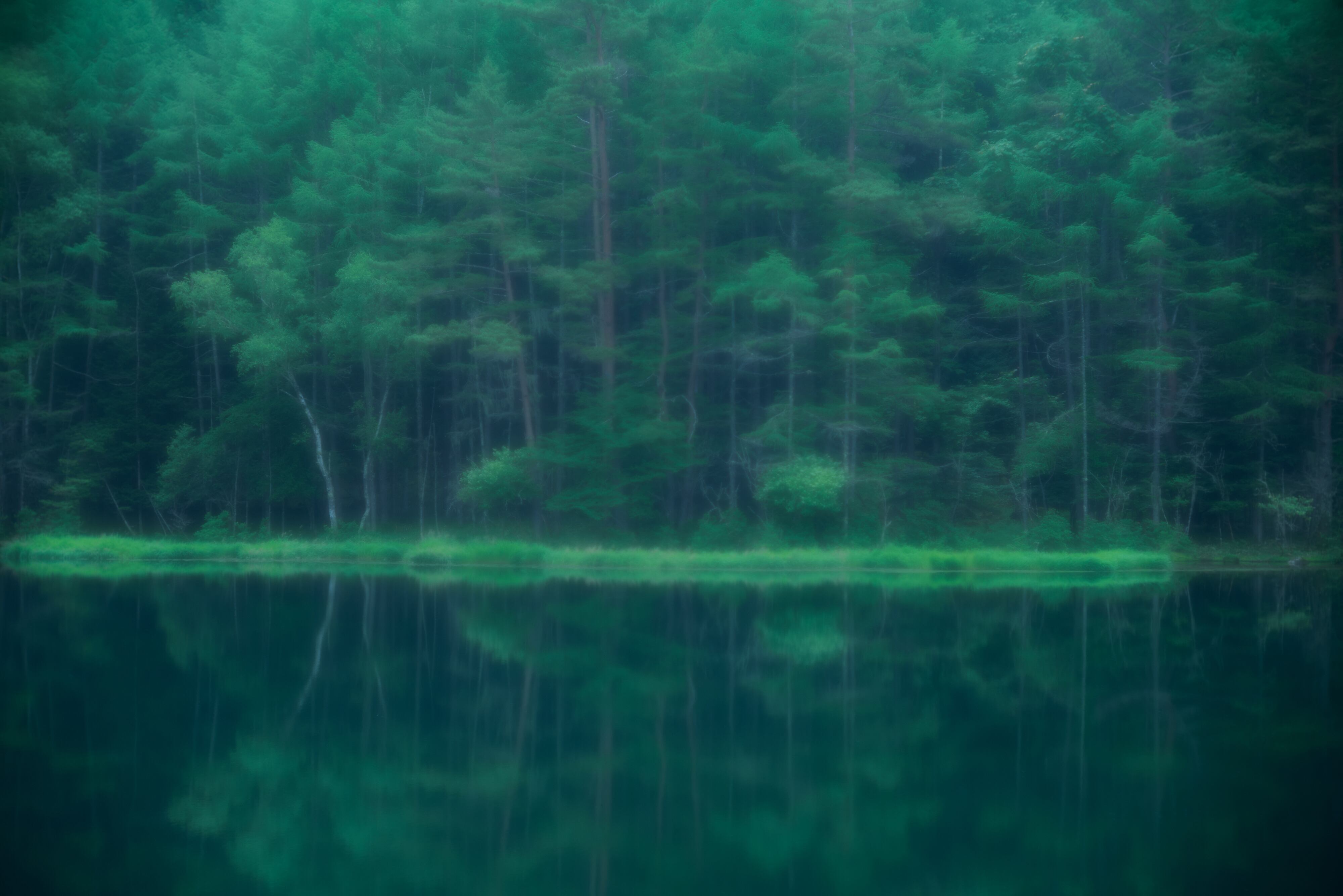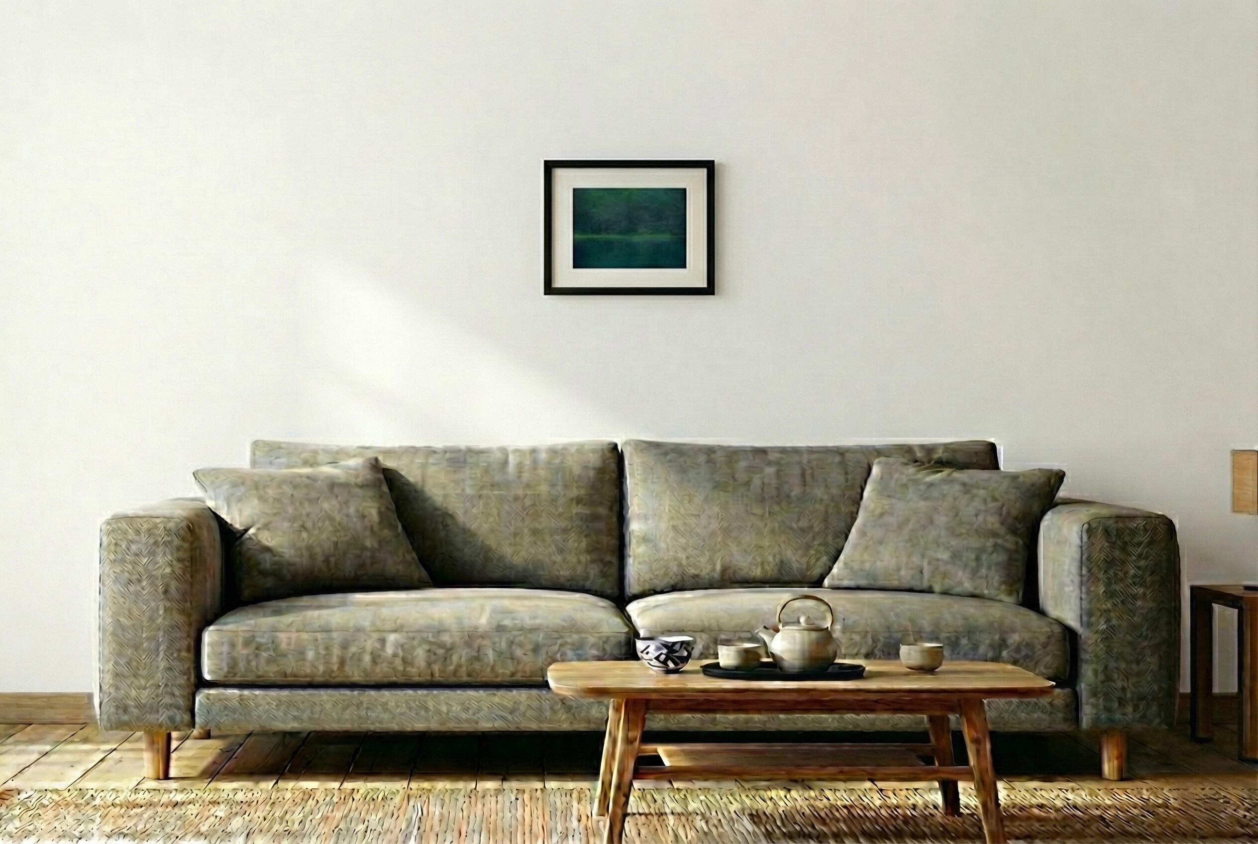東山魁夷の代表作「緑響く」を再現した一作。モチーフとなった御射ヶ池を特別なレンズを使い、あえて”あいまい”な世界を表現しました。写真でありながら絵画のようなこの作品は、空間に静謐さとやわらかさをもたらします。光により微妙に変化して見えるのも特徴的なところ。